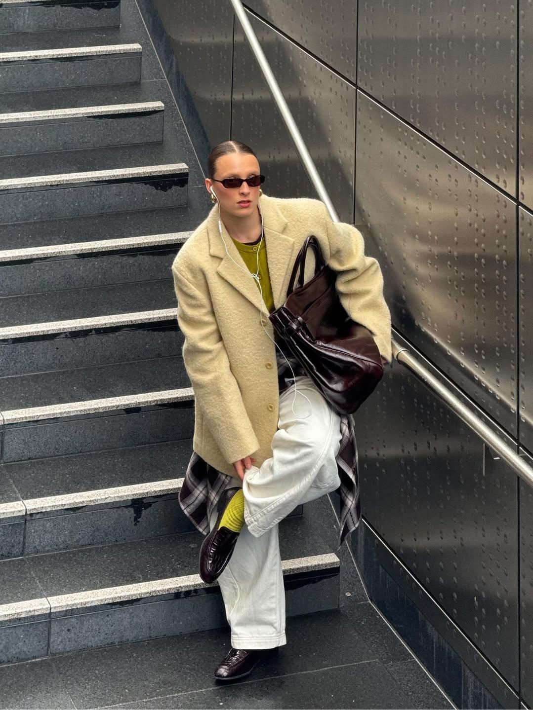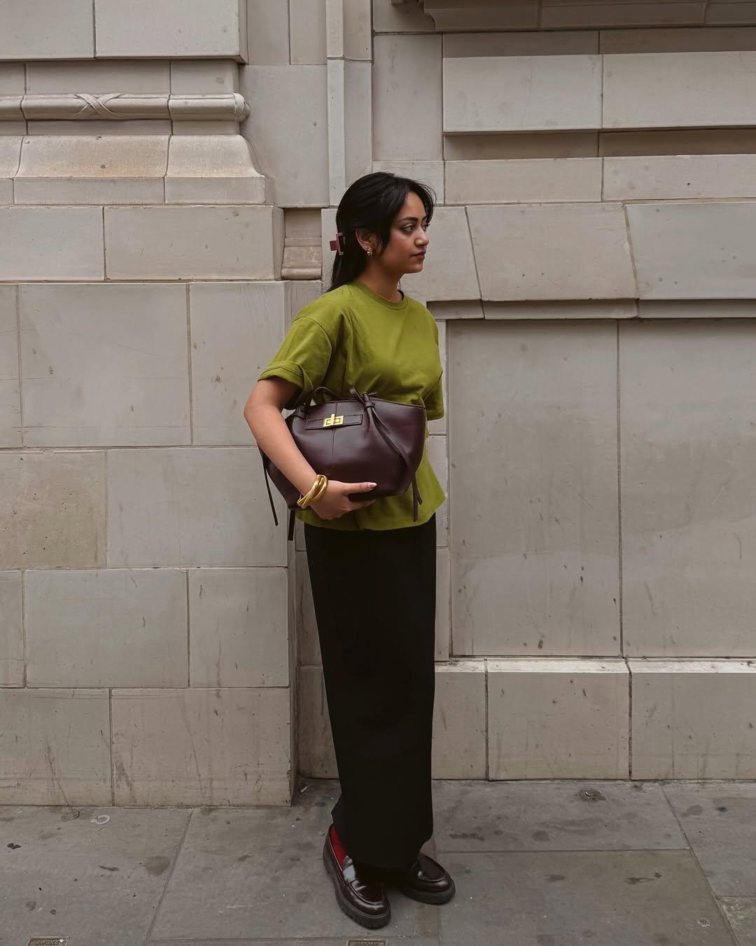 Еще один — но уж точно не последний — вариант для тех, кто хочет полностью отдаться тренду: использовать метод цветового акцента. Для этого выбирается основной оттенок и составляется тотал-образ, а единственный аксессуар — чаще всего сумка — подбирается максимально противоположной всему аутфиту. Именно он в конце концов и работает на эффектность, притягивая к себе максимальное внимание.