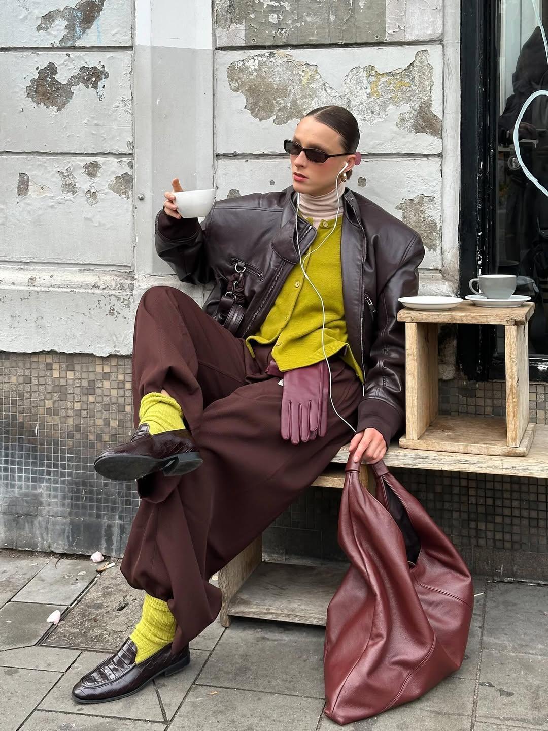 Поэтому один из вариантов стилизации — добавлять аксессуары обоих цветов в один аутфит. Например, к оливковым ботильонам в пару подбирать винную сумку, вместе с бордовой шапкой надевать приглушенно-зеленый шарф, к темно-красным лоферам добавлять контрастные носки. Остальная одежда при этом может быть самых базовых цветов — белого, черного, серого и бежевого. Или, напротив, усложнять гамму дополнительными оттенками — кобальтовым синим, теплым розовым, лазурным, лаймовым, трендовым royal purple или гремевшим этим летом цветом сливочного масла.