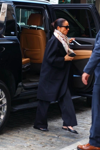 После мероприятия их пути с мужем разошлись — гораздо чаще они выбирались поодиночке. Например, 11 октября Меган встречалась со своими друзьями и была сфотографирована папарацци в момент, когда выходила из машины. В тот день на ней было объемное кашемировое пальто Max Mara, шелковый платок Hermès с принтом и красной каймой, а также туфли Saint Laurent с острым носом и открытой пяткой. Завершить образ ей помогли солнцезащитные очки Heidi Merrick, золотые серьги Guzema и, конечно же, любимый браслет Cartier Love.